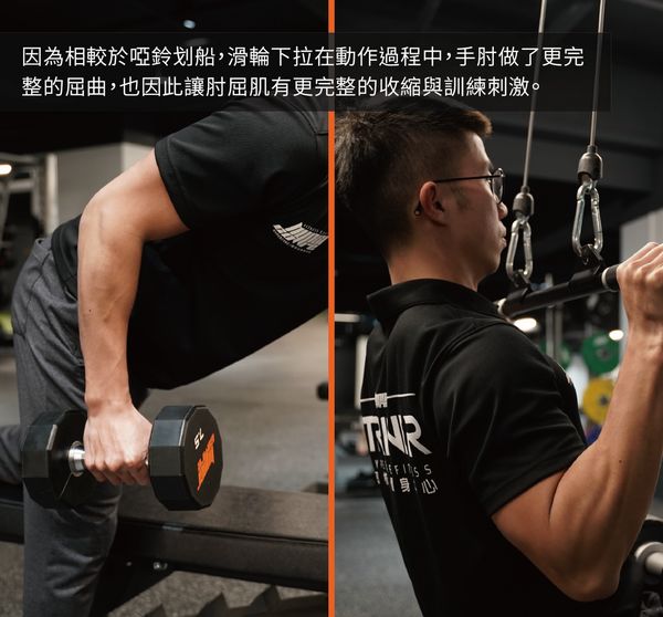 其實如果你仔細思考的話,會發現相較於啞鈴划船,滑輪下拉在動作過程中,手肘做了更完整的屈曲,也因此讓肘屈肌有更完整的收縮與訓練刺激。