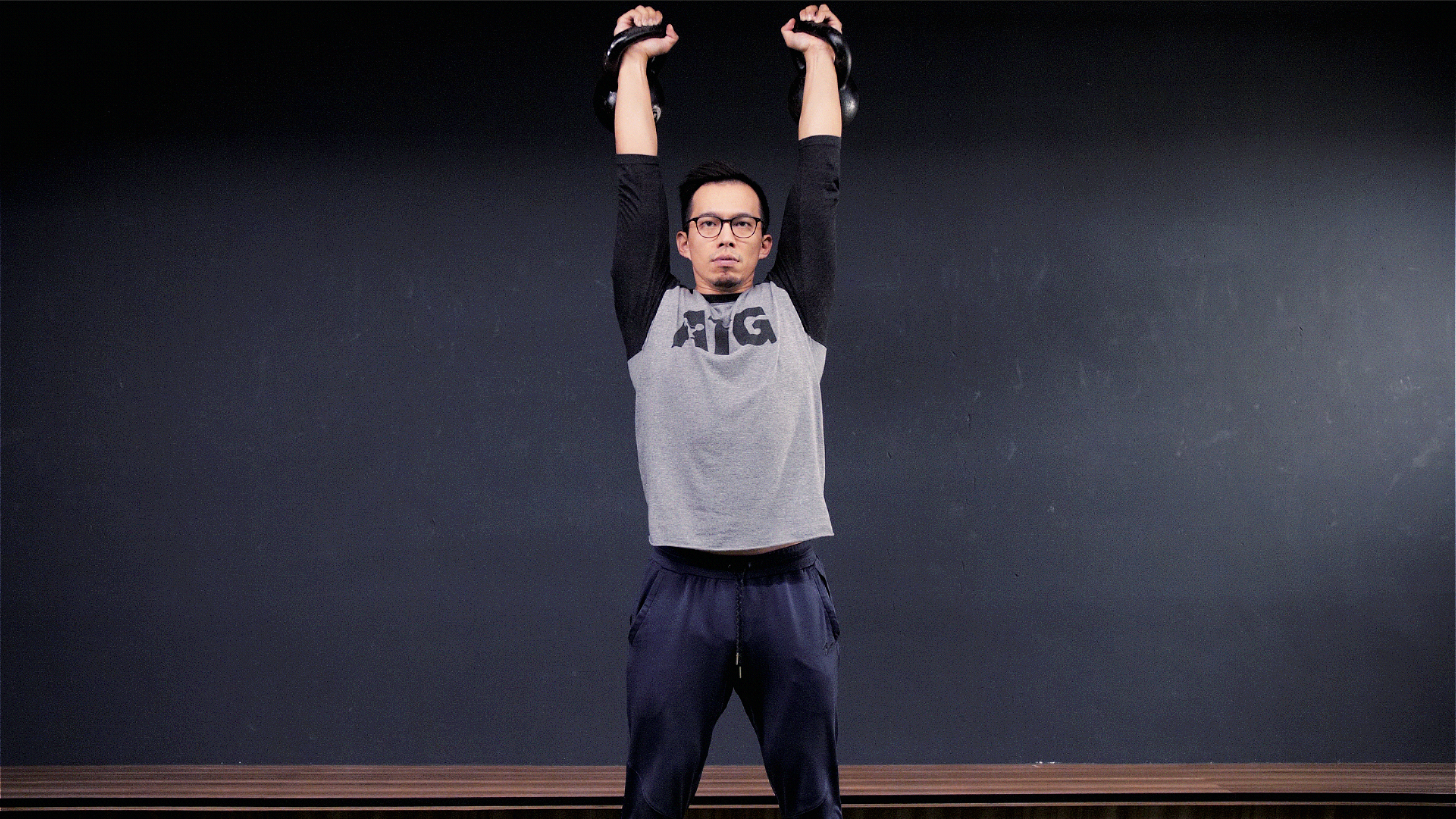 而第一堂課的雙壺借力推是最容易入門的壺鈴爆發力動作,透過下肢發力,將壺鈴重量往上送,